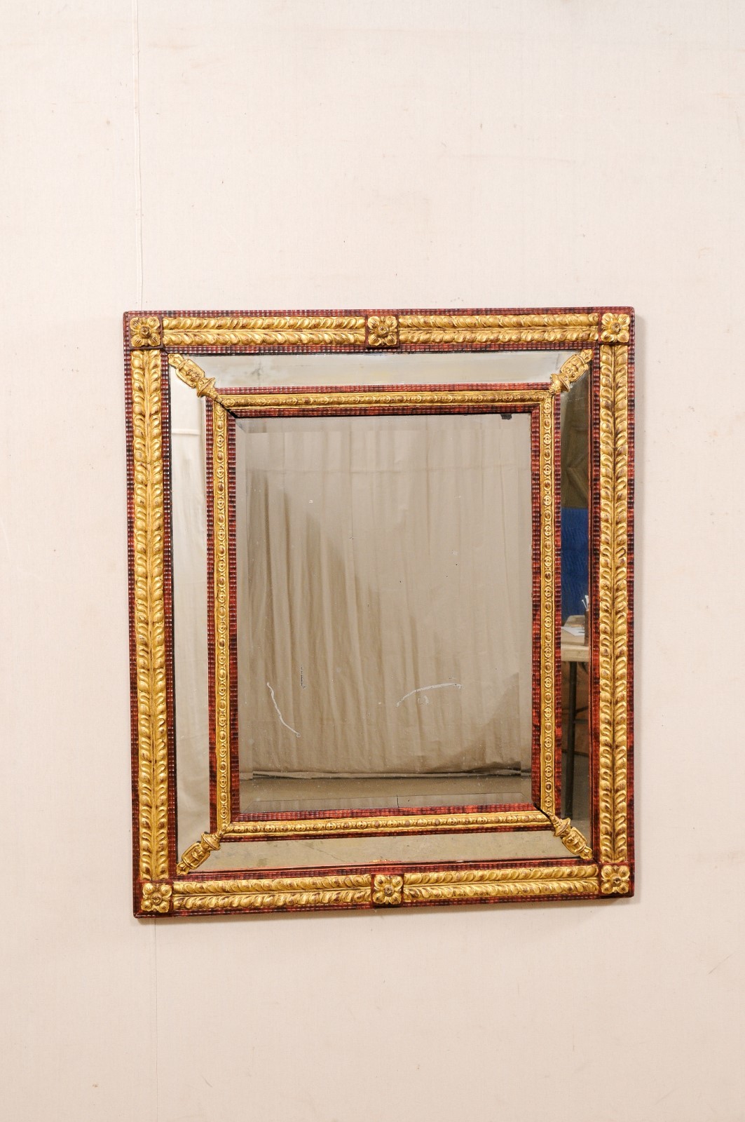 An Italian embossed repoussé mirror from the 19th century. This antique mirror from Italy features a repoussage or chasing/embossing floral and leaf motif in metal (applied atop a wooden frame) which adorns the larger outer surround, inner surround (which is divided by narrow mirrors) and accentuated corner embellishments. The larger inner glass is presented in a raised center panel, and has beveled edges. The gilt gold is complimented with a cranberry red. Note that the mirror is old, but not original to this piece and that there are some scratches to the glass, and some slight separations at frame corners. This 19th century Italian mirror is nicely sized, standing approximately 4.25 feet in height.