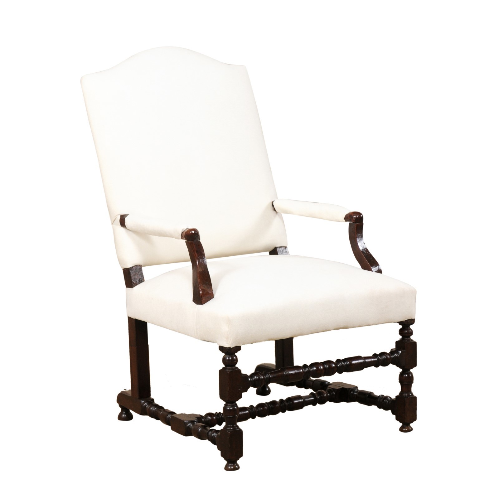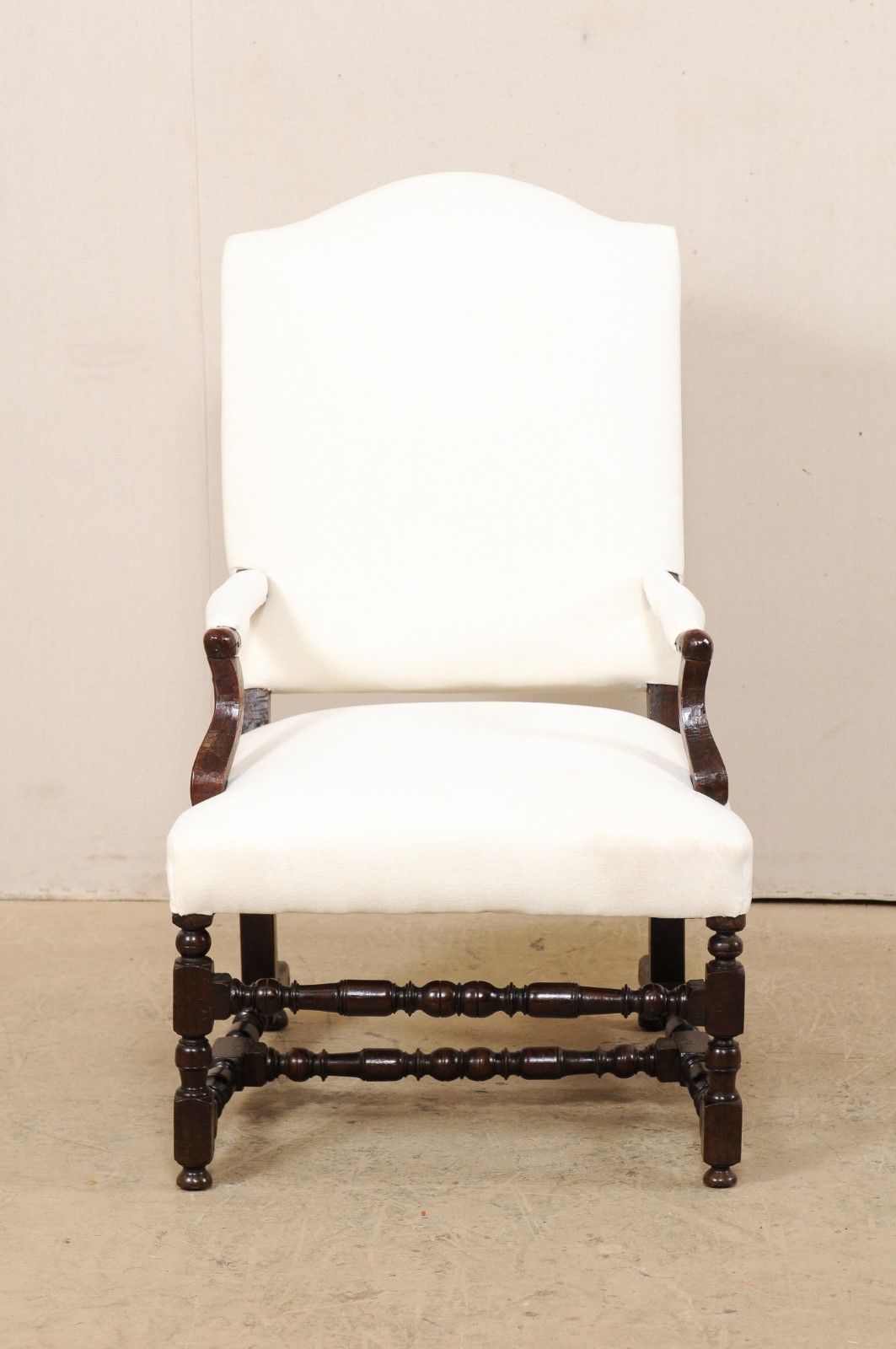 An Italian carved wood arm chair from the 18th century with new upholstery. This antique chair from Italy has a large camel-back which is set at a comfortably reclined position, with upholstered seat, back, and arm rests. The chair is raise on nicely carved turned front legs, front stretcher and a matching H-stretcher, while rear legs remain uncarved. The side stretchers extend out just past the back legs, and are raised on petite bulb feet, giving this chair a unique look from a side perspective. This piece has been newly upholstered in a velvety flour-white fabric, which is a sophisticated contrast to the dark wood frame. This 18th century Italian armchair will make a handsome addition to an office, bed, or living room.