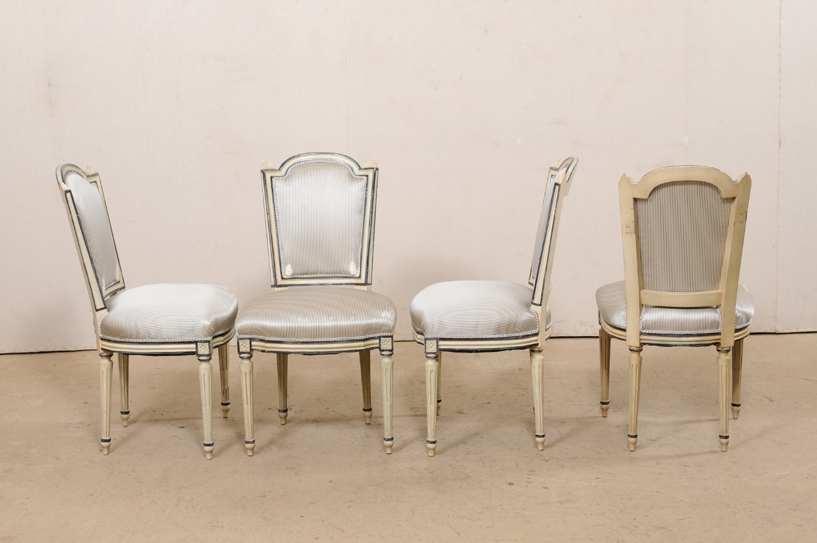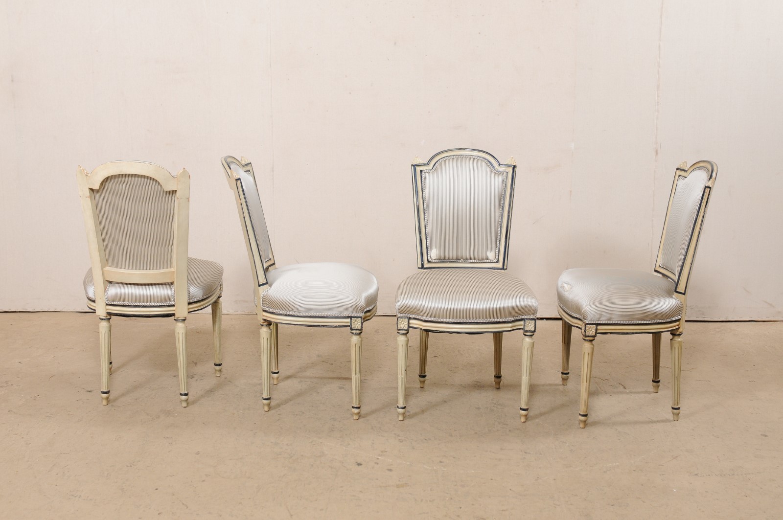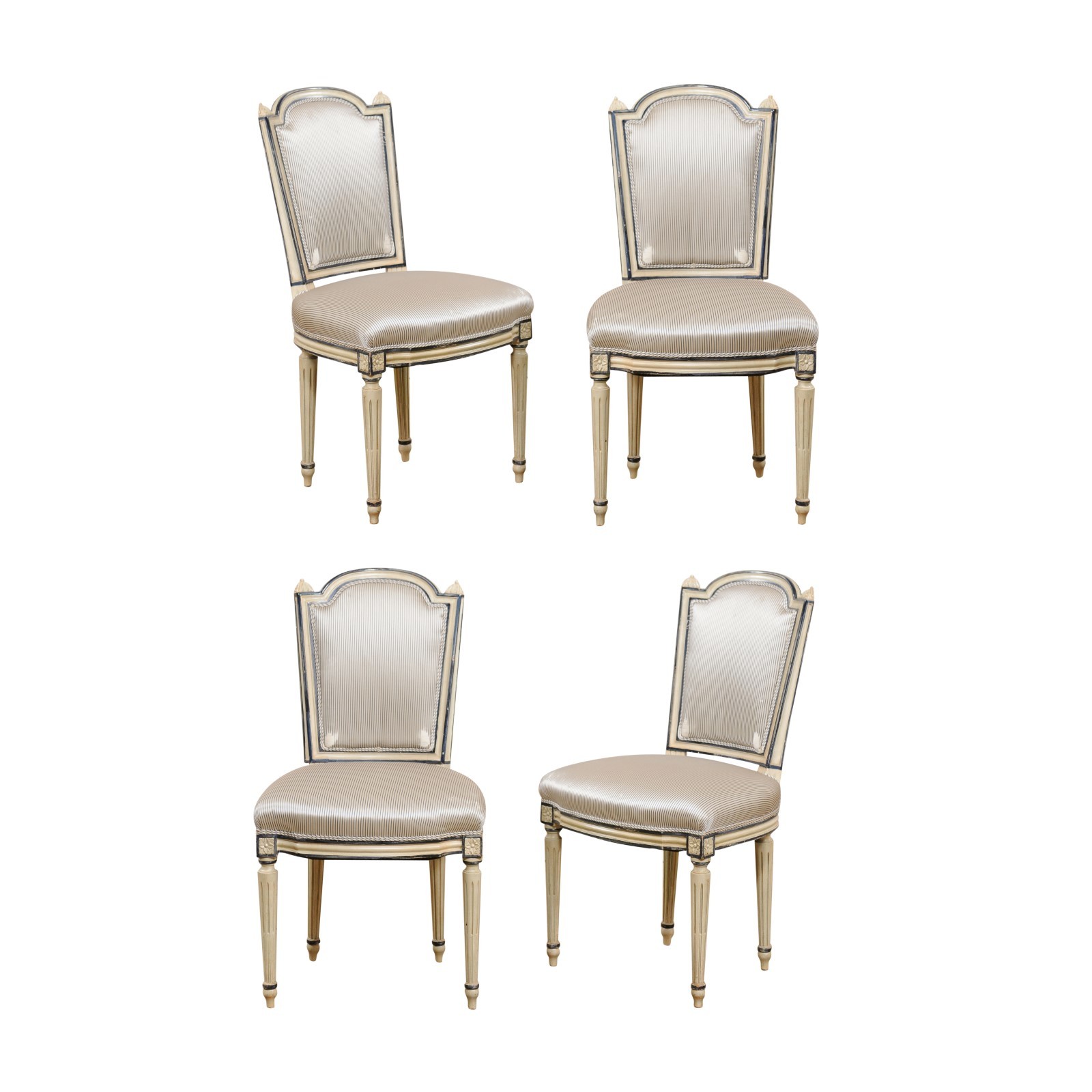 A French set of four carved-wood and upholstered side chairs from the mid 20th century. This vintage set of chairs from France each have carved-wood framed backs with a wide/elongated arched top rails and carved finial accents at shoulders, with upholstered cushion-back centers. Shapely, upholstered seats give way to a simple and clean molded trim about the skirt, which is embellished with flower carved accents just above the front legs. The chairs are raised on four rounded and flute carved legs, which taper gently and sit on toupie feet. The color palette of these chairs is shades of taupe, champagne, and navy. Current upholstery is older and could use a refresher to complete and customize the look for your home. These French side chairs will be great option for a small dining arrangement, office seating, or games table.