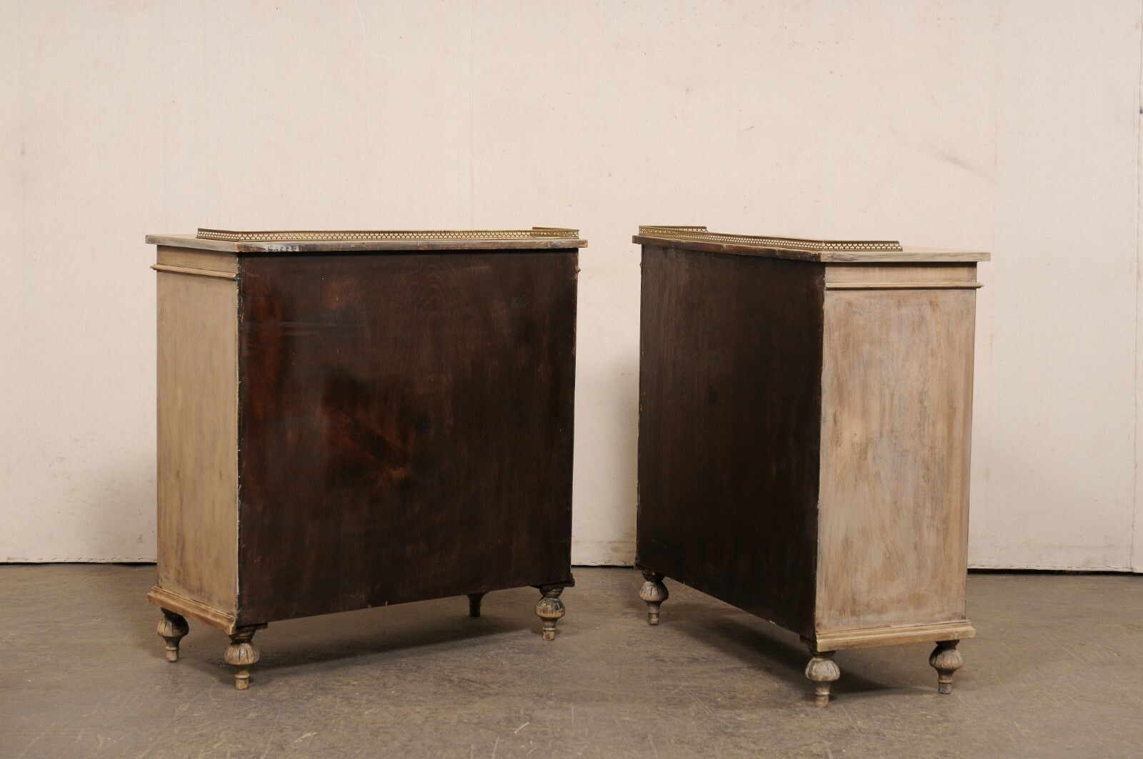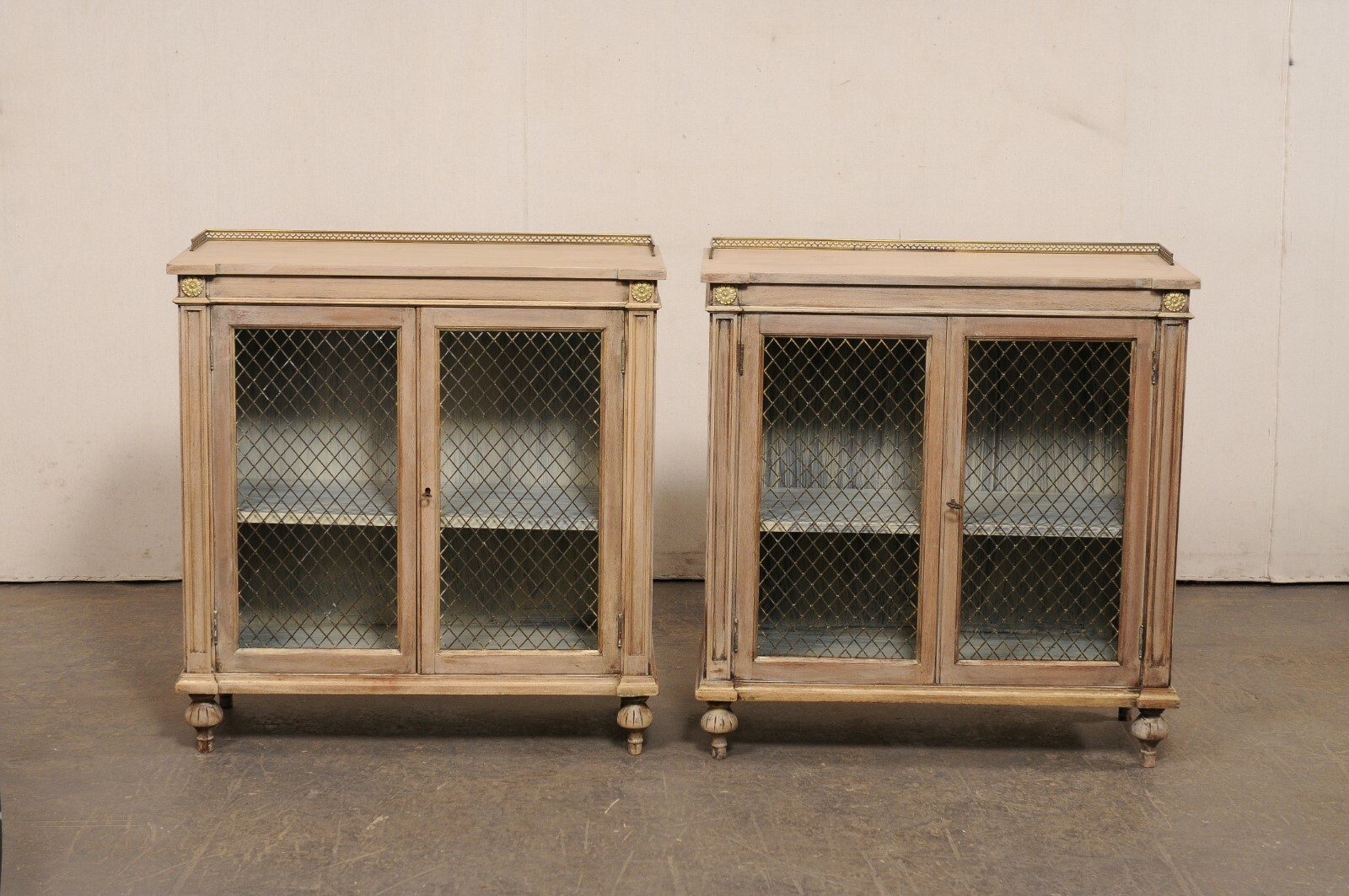 A French pair of Neoclassical style, wire-front bookcase console cabinets. This vintage pair of cabinets from France each stand approximately three feet in height, and have a shallow reverse breakfront design, partial brass gallery edging (with sweet little heart cut-outs) along their tops at backsides, and are fitted with a pair of wire front doors. Small gold colored rosettes embellish each top front corner. The cases are each presented on four nicely-carved feet. There is a custom gold wash on the trim, and blue/gray interior coloring- which contrasts nicely to the neutral exterior. This pair of French Neoclassical style bookcases would be fabulous flanking a living-room seating arrangement or perhaps anchoring the underside of a pair of windows.