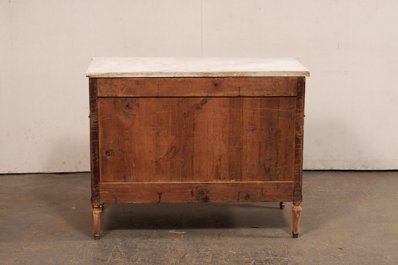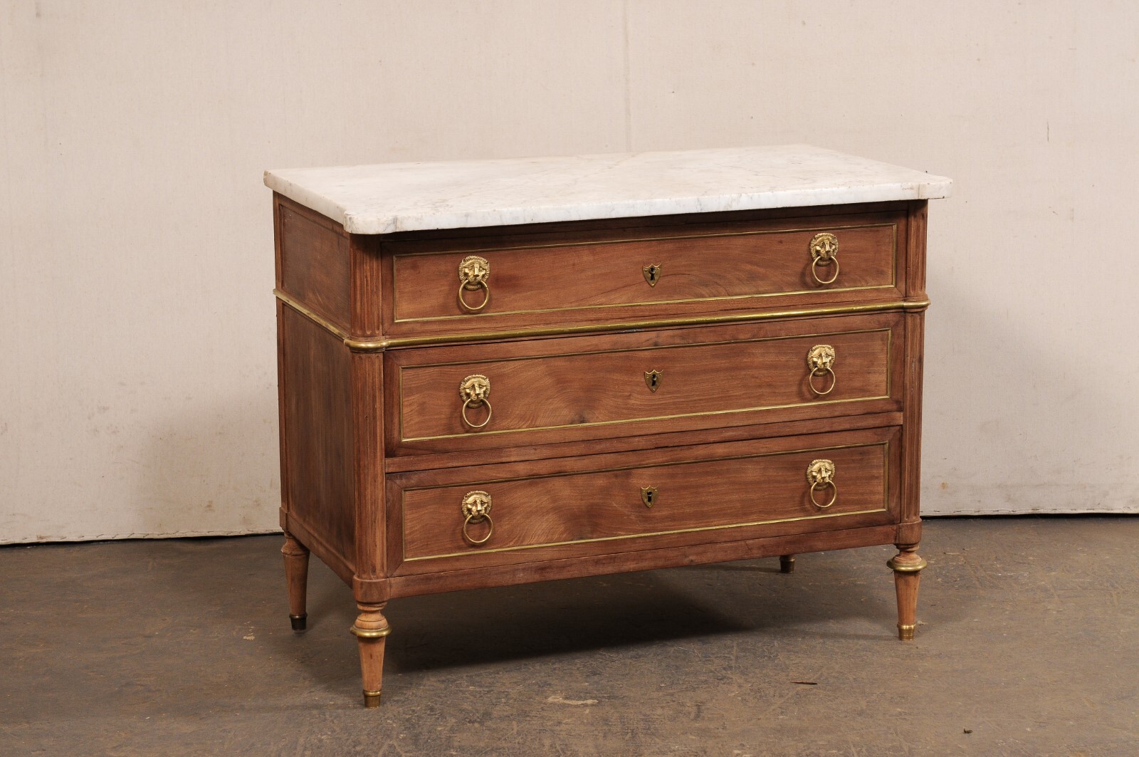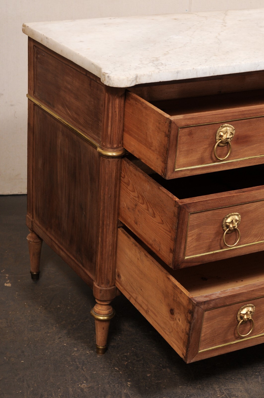 A French Neoclassical commode, with its original marble top and brass accents, from the 19th century. This antique chest from France features a rectangular-shaped marble top, with pronounced rounded corners at front, which rests atop a neoclassical case with rounded and fluted front side posts which flank three full size graduated drawers. Each of the dove-tailed and recessed-panel drawers are outlined with brass trim, and fitted with a pair of brass lion's head bail-pulls, and a shield-shaped escutcheon keyhole at their centers. This commode is presented upon conical legs with brass trim at their bulbous tops and terminating into brass peg feet. The original marble is off-white with soft gray/taupe veining. The wood has been stripped to allow the beautiful fruitwood grain to show throughout. This 19th century French Neoclassic commode has all the bells and whistles to be a gorgeous statement case piece for your bed or living room design.