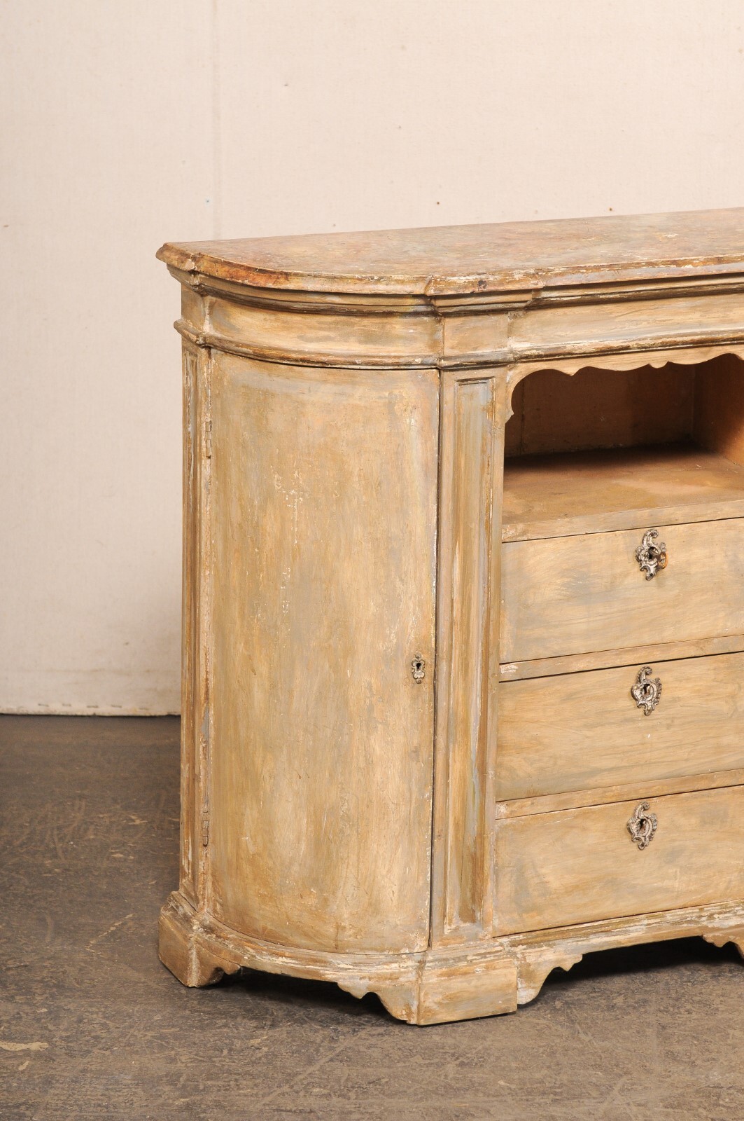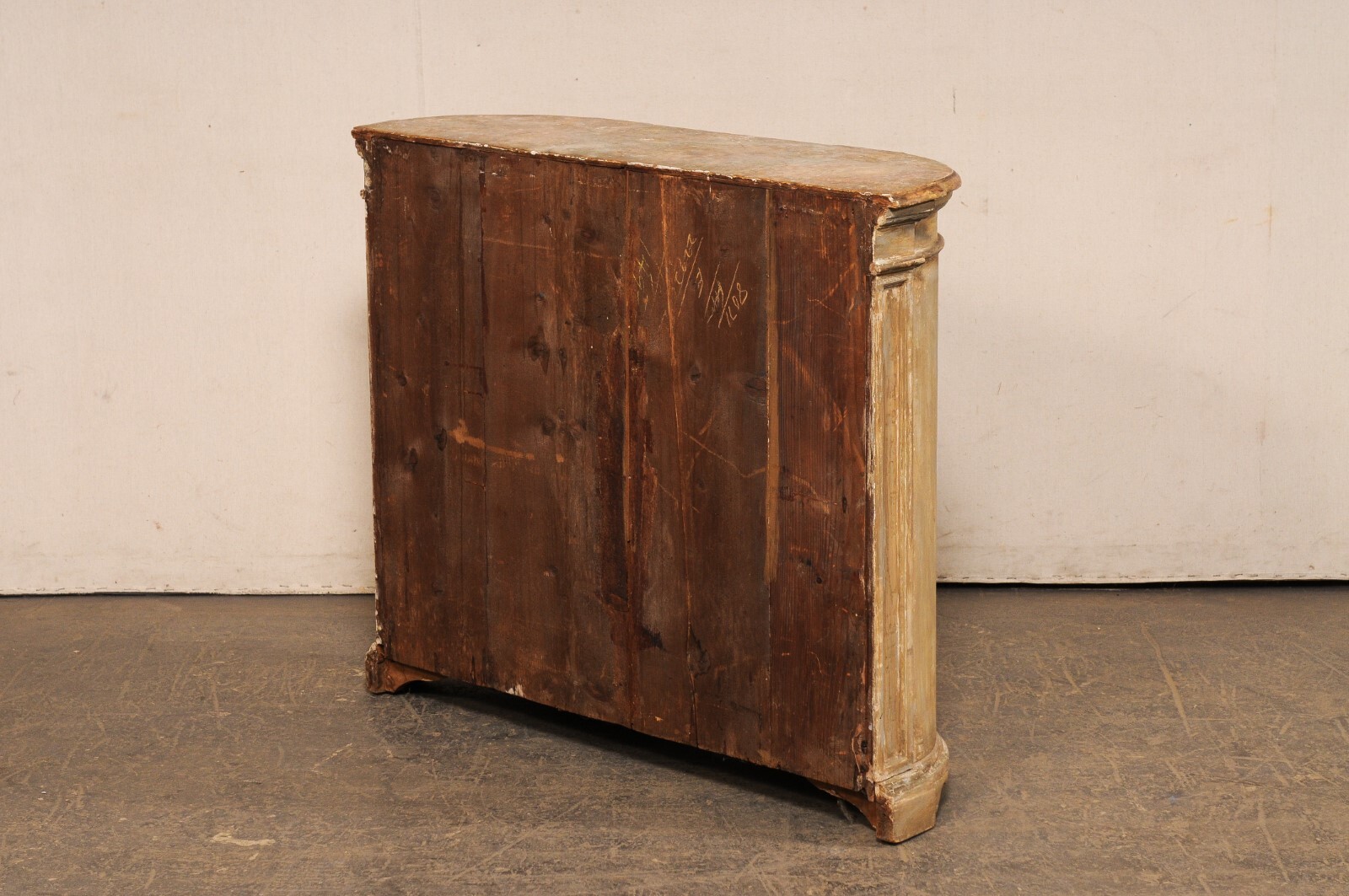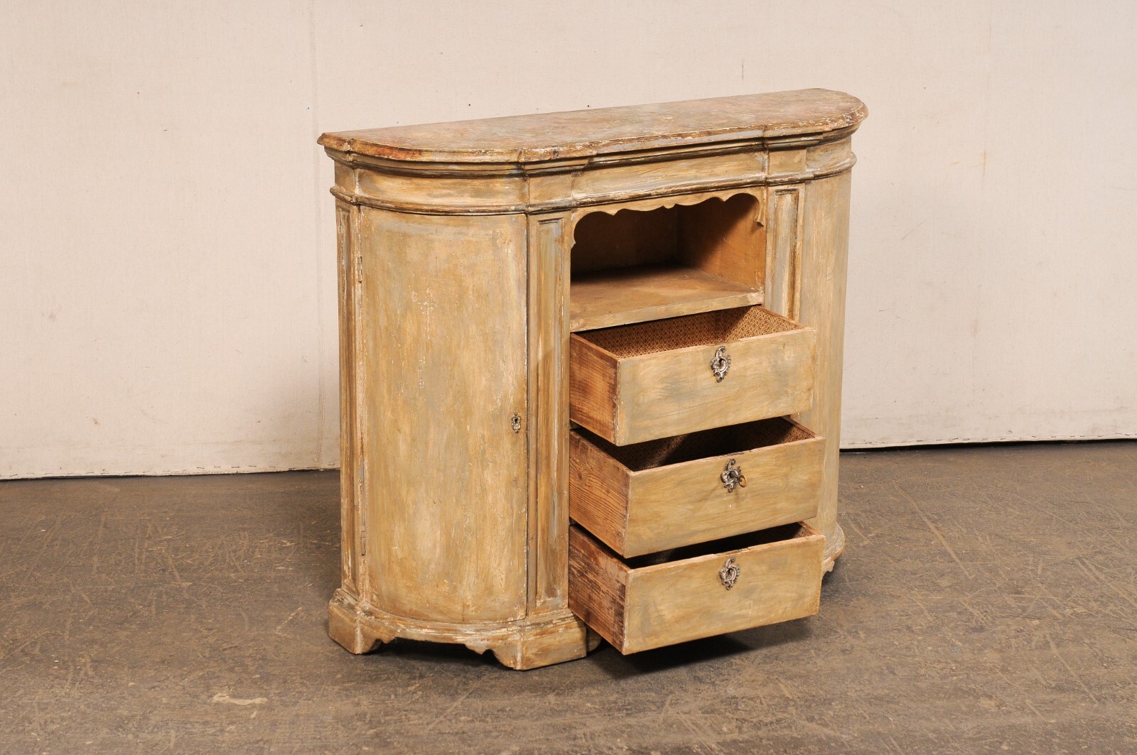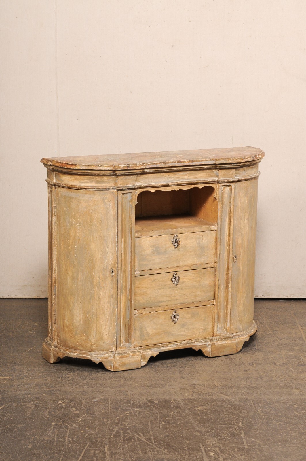 A French painted-wood console cabinet with open cubie and faux marble top from the 19th century. This antique cabinet from France has a half-moon shaped body with a it's original faux-marble painted top, over lower case which houses a small center cubie shelf above three centrally stacked drawers. A pair of smoothly-curved doors flank the middle cubie and drawers along either side. Rococo style escutcheon hardware lends and elegant touch to this piece. This chest is raised upon bracket style feet, giving a slight lift from the ground. The faux marble top (original) is full of warm gold and brown tones. Complimented by scraped finish of the base cabinet, with primary color palette in gold and grey. This 19th century French console is a cute size piece and perfect problem solver- with a width of approximately 3.25 feet and slender depth of approximately 1 foot.