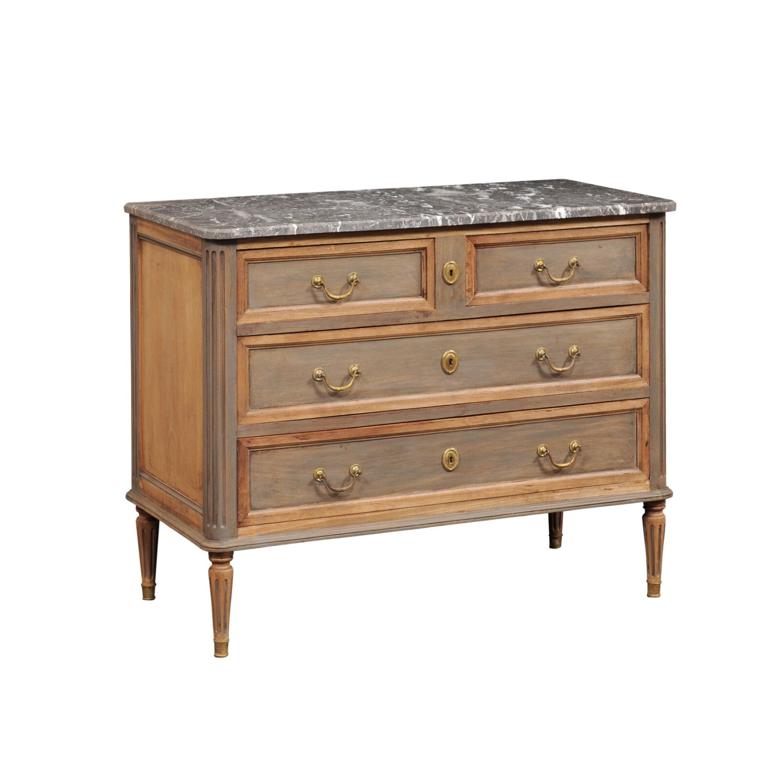 A French Neoclassical style chest, with its original marble top and hardware, from the early 20th century. This antique chest from France features a rectangular-shaped gray marble top with softly rounded front corners, which rests atop a neoclassical style case that houses a pair of half-size drawers over two full-sized drawers (for a total of four drawers), flanked within rounded and flute-carved side posts. The recessed-panel drawers are fitted with the original brass hanging bail-pull handles and oval escutcheons set at their centers. This commode is presented upon conical, flute-carved legs that taper down onto brass feet. This piece has a custom light grey wash on the drawers and trim, which still allows much of the natural wood grain to show through, and compliments the natural finish throughout the remainder of the body. The original marble top is grey with white veining, and looks like there may have been a prior professional repair to it. This early 20th century French Neoclassic style chest-of-drawers is a beautiful case-piece that could function well throughout your home; offering storage within and a place for desired objects to be prominently displayed atop.