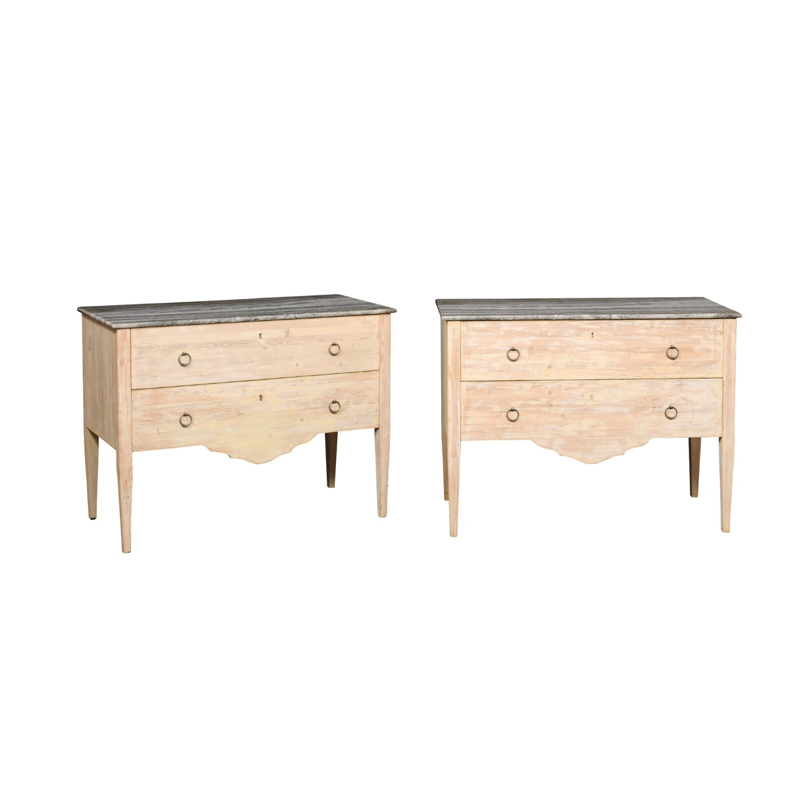 This Item Is On HoldAn Italian pair of raised two-drawer chest of drawers, with marble tops, from the later part of the 20th century. These vintage chests from Italy each features a rectangular-shaped grey marble top, which rests atop the wooden case that houses two minimally adorn drawers fitted with a pair of ring pulls. The skirt is carved at front center, with the remainder of the skirting along sides being clean and linear. The chests are presented upon four tapering squared legs. The wood has been scraped to show much of the natural wood, and softly washed with a creamy/ivory color which compliments the grey stone top. This pair of Italian raised marble top chest of drawers will make a fabulous pair of decorative storage and display pieces, perfect for your bedroom or other living area.