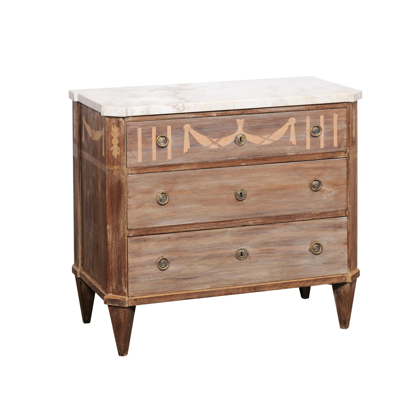 A Swedish wood chest, with beautiful inlaid embellishments and custom quart top, from the 19th century. This antique chest from Sweden has been fitted with a new quartzite "Taj Mahal" top which rests atop a case that houses three dove-tailed graduated drawers, flanked within canted side posts, and is raised on spade style legs. A lovely Neoclassical inspired inlay wood design is featured about the top drawer, side post and each side in a swag motif. The drawers are fitted round ring pulls with backplates and a rounded escutcheon at center. The wood has been stripped down to its natural wood finish, with a light wash over color over the drawer fronts. This 19th century Swedish chest, with new quartz top, is such a cute and very-well made piece! It would be fabulous in a bedroom, entry hall or living room!