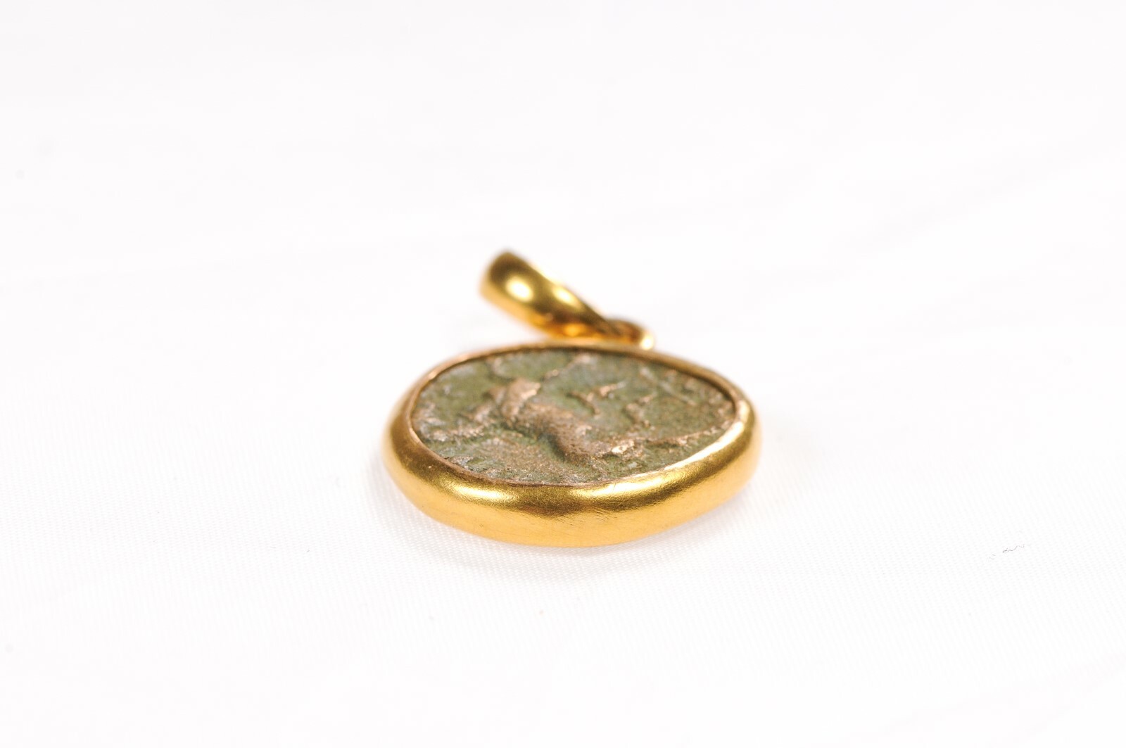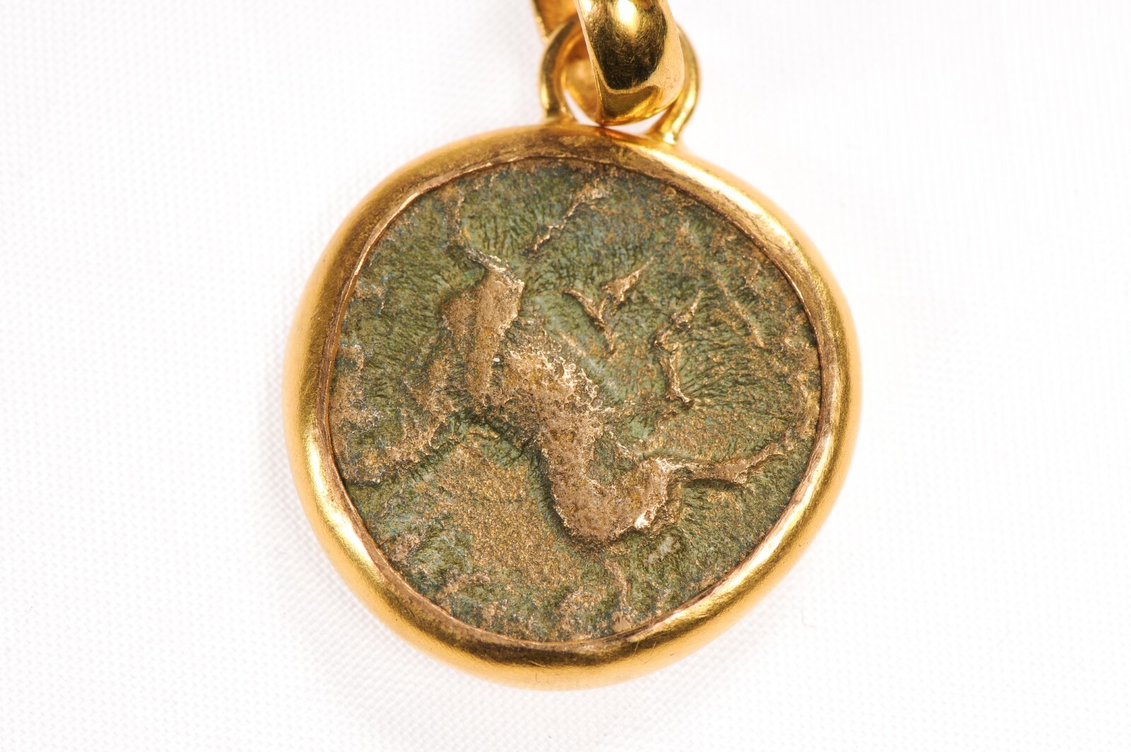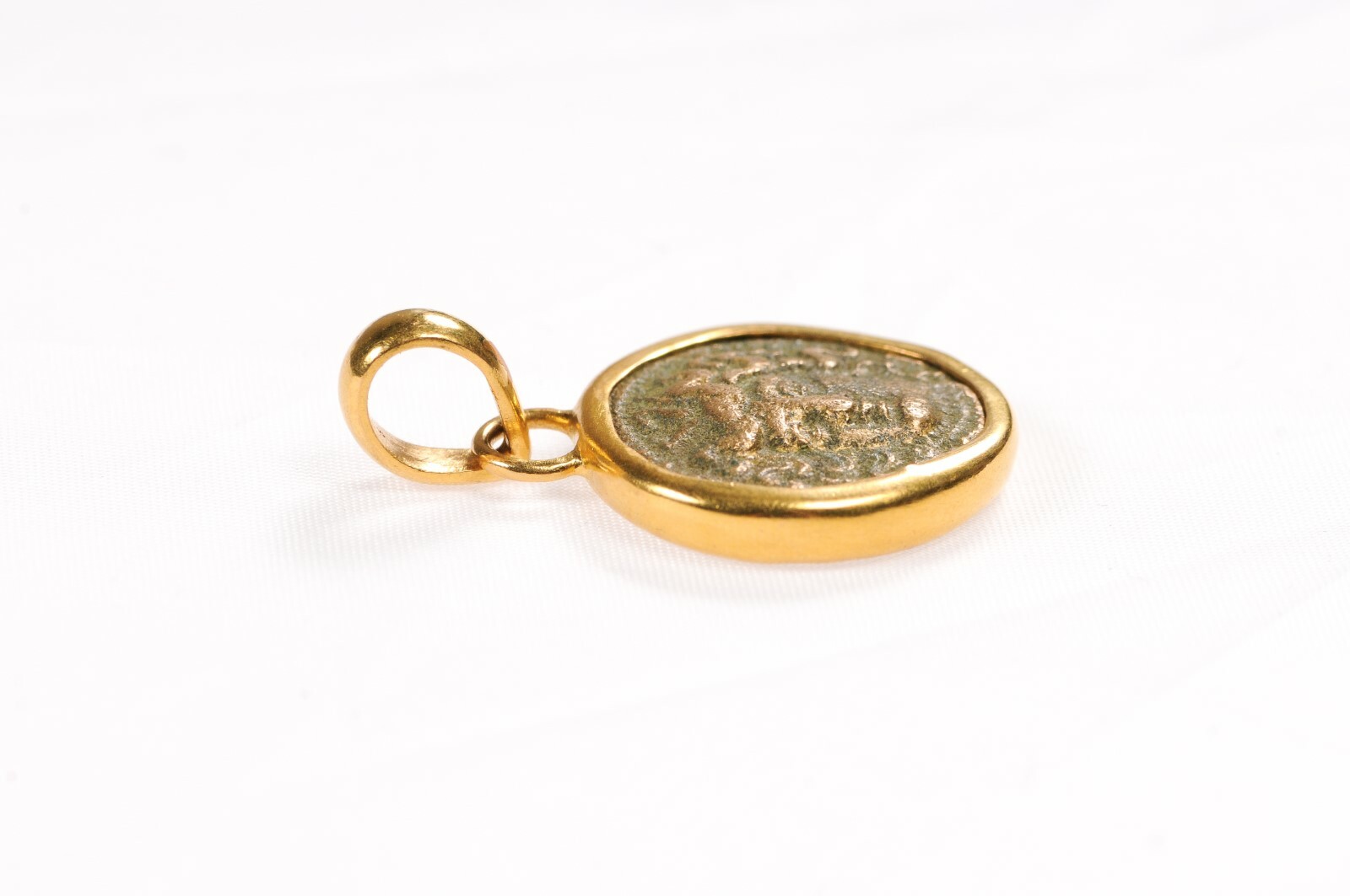 An Authentic Greek bronze Tetrachalkon coin (circa 400-344 BC). This ancient Greek coin has been set within a custom 22k gold bezel with 22k gold bail. The obverse, or front side of this coin, features the head of Nymph Larrisa. On the reverse side, a prancing horse. This coin has been inspected and approved to be authentic by a professional Numismatic who specializes in ancient coinage. A Certificate of Authenticity will accompany this coin. Coin pendant, including bail, measures approximately 1.25" tall, 13/16" wide, 1/8" deep at bezel. Chain is for display purposes but can be included at no additional charge.