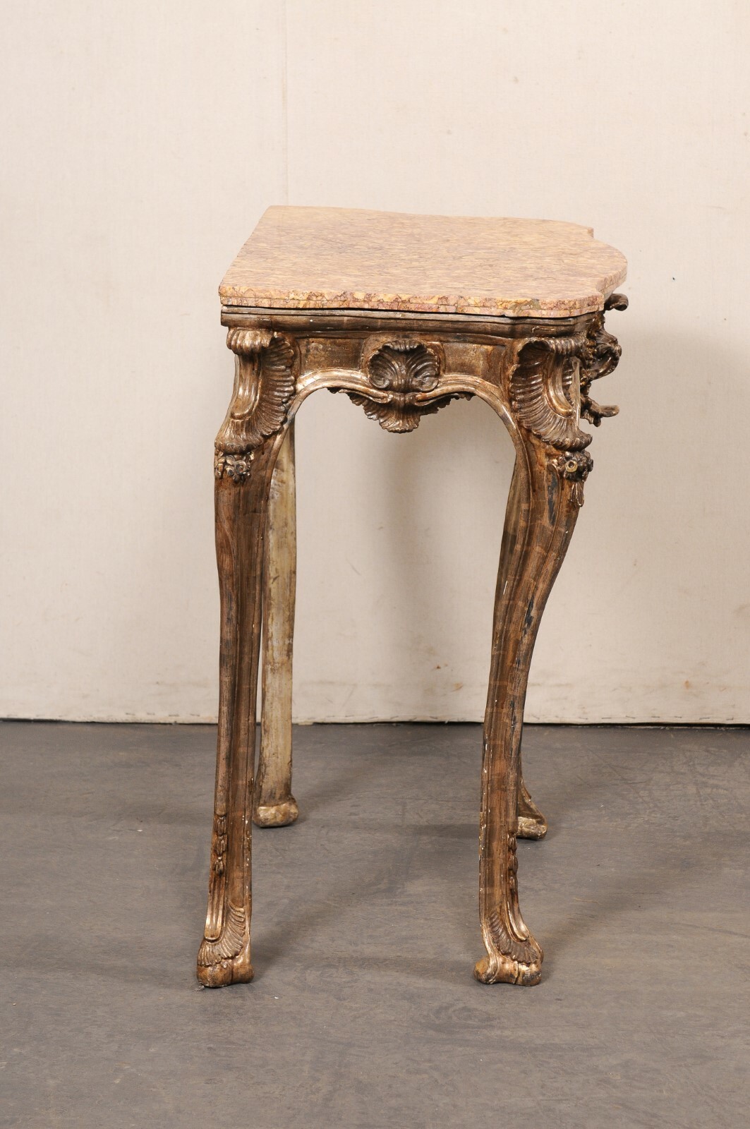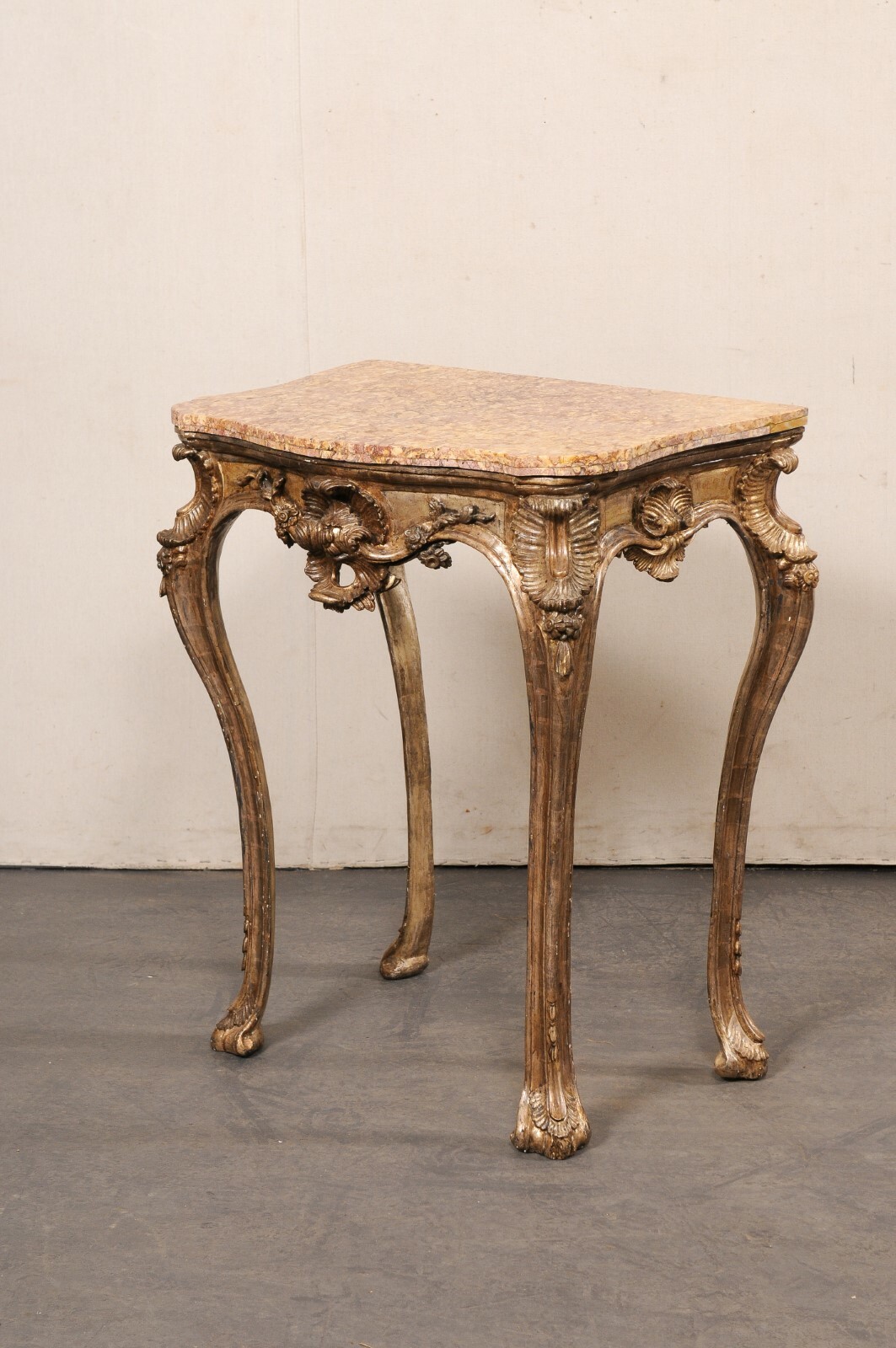 An Italian Rococo smaller-sized carved-wood table, with its original finish and a marble top, from the 18th century. This antique side table from Italy has a beautiful marble top with curvy serpentine front, canted and bowed side corners, and shapely sides, with a flattened backside (as made to rest against a wall). It rests upon the apron with elaborately-carved frieze in a shell and floral motif, with pierced carving embellishing the front center. The knees are adorn with carved flowers with tassels, making their way down the four elongated cabriole style legs, each with carved leaves and inwardly scrolling feet which give them a paw-like appearance. The marble is older, but likely not original to the piece- but a rather skillfully done replacement. The coloring is comprised of squash and umber tones with a slightly pinkish/salmon color. The table retains its original bronze/gold and brown finish, which has a light patina but in great overall condition. This period Rococo Italian console, approximately 2.5 feet in width, is a perfectly petite table, with high impact on design and style.