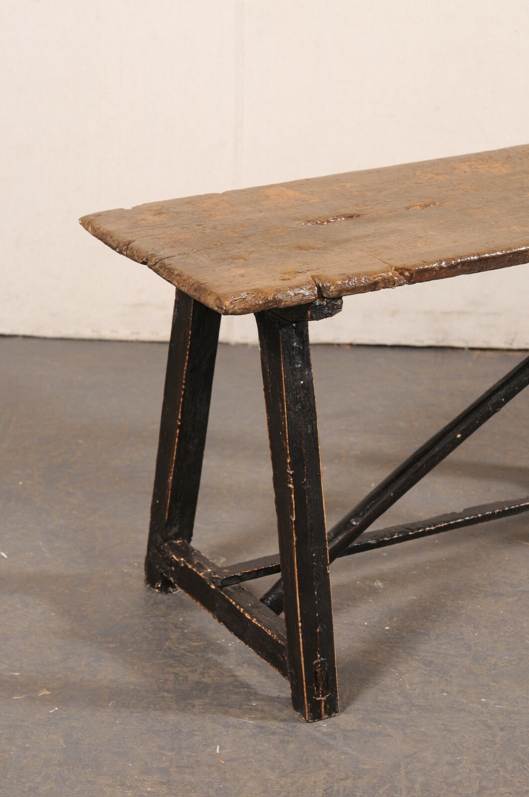 A rustic Spanish wooden table with trestle legs from the 19th century. This antique table from Spain has a rectangular-shaped top, made from a single board, which spans just over three feet in length. It is presented upon a pair of wooden saw-horse style legs, which are braced with a stretcher bar across and a rounded and diagonally positioned brace. The top of the table is is a medium tone with notched cut-outs and a great patina, with legs and stretches having a darker stain. This rustic little 19th century Spanish table is a versatile piece which could function as a coffee table, an accent table, or perhaps even be used a single shelf for displaying plants or an art collection.