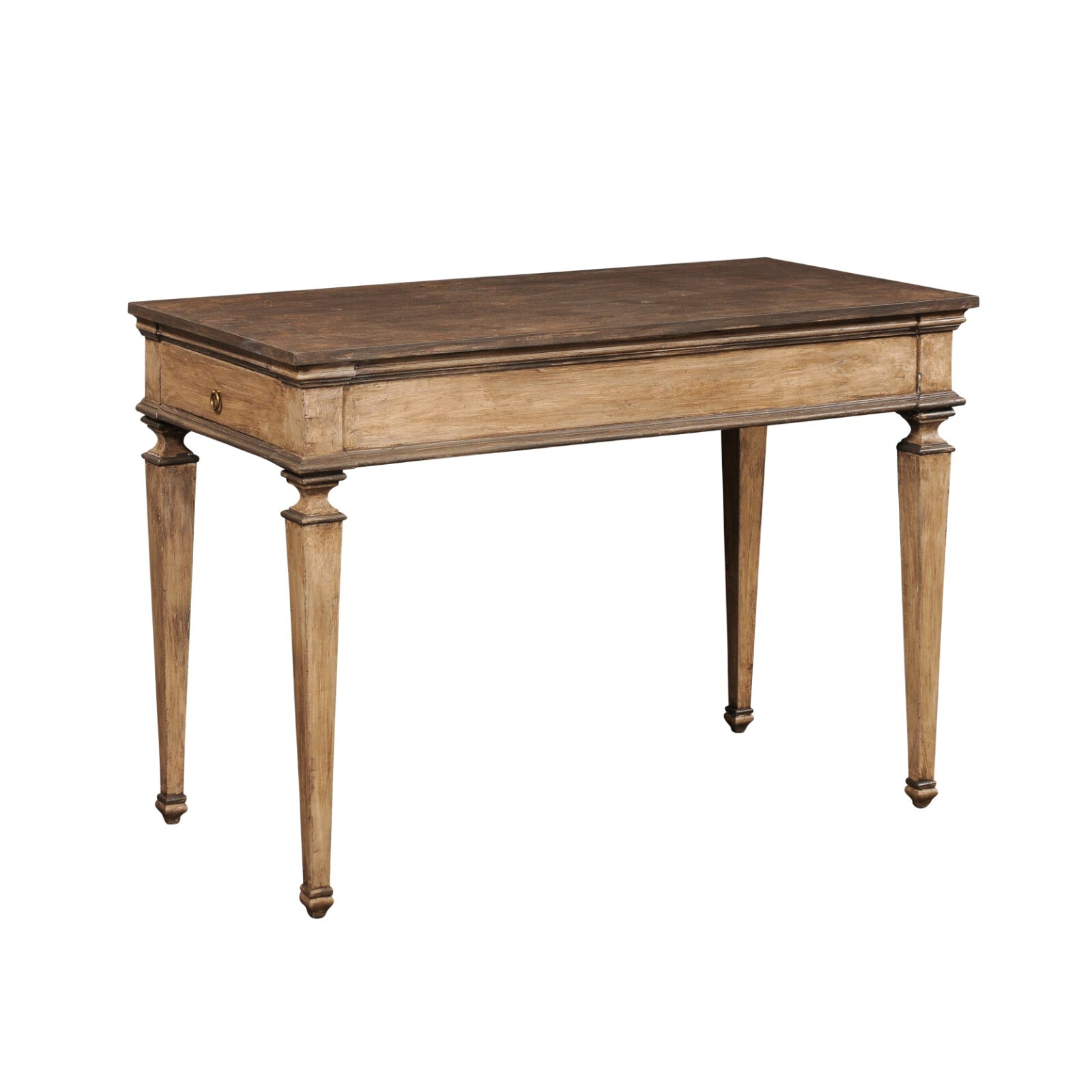 An Italian painted wood console table with drawers. This vintage table from Italy has a rectangular-shaped top over an apron with straight line molding about the top and skirt, and houses a drawer at each far side. It is raised upon four squared legs, each with concave/profiled knees, that gently taper towards their feet. The wood has a newer custom taupe finish with grey accents. The backside of the table remains un-adorn so best use is to be placed against a wall. This Italian console table, with unique side drawers and clean design, is a nice versatile size (at just over 4 feet in width) which could be a useful piece in many rooms throughout the home.