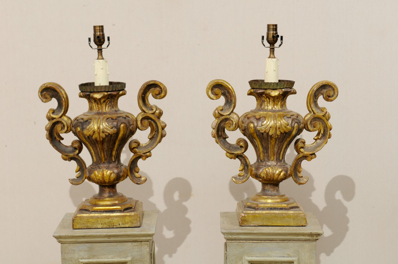 A pair of Italian Rococo style table lamps. This pair of 19th century Italian Rococo style, gilded and painted table lamps feature an decorative urn shaped body with side handles comprised of a series of c-shaped scrolls, foliage motif. These Italian gilded table lamps are a gilt with warmer bronze paint. The lamp is raised on a square base. This pair of 19th century Rococo style lamps would look amazing flanking sides of a console table or set at either side of a living room sofa.